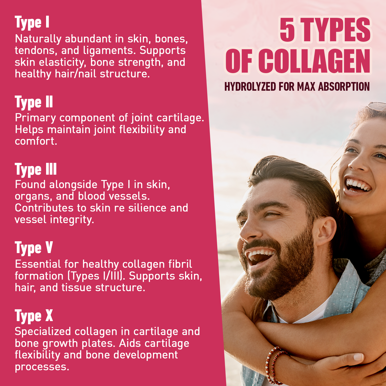 - 5 COLLAGEN TYPES FOR MAX BENEFITS: Features collagen types I, II, III, V & X from grass-fed bovine, fish, cage-free chickens & eggshell membrane. Multi collagen peptides support joints, skin, hair & nails holistically.
